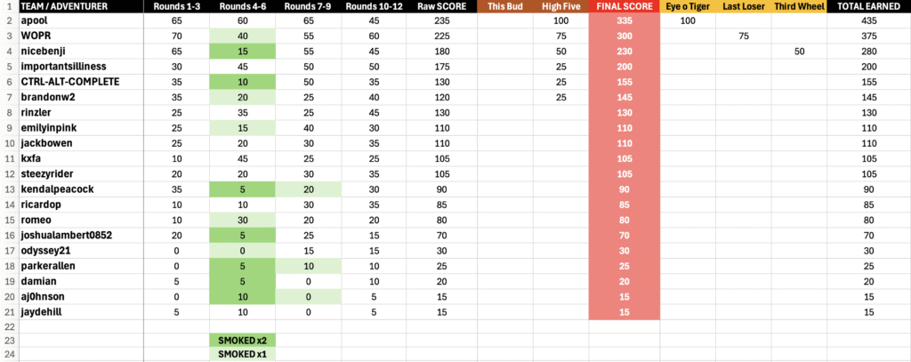 Once the fog lifted, the fight resumed in full force with most combatants regaining their senses and racking up better point totals during the latter Rounds. While the front runners continued to set the pace for the field, importantsillinessrinzlersteezyrider, emilyinpink, and the new Adventuring Party CNTRL-ALT-COMPLETE (formed at the very last second) scoring particularly well in the last Quarter.